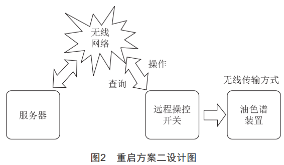 通過搭建后臺服務(wù)器與研發(fā)重啟操控開關(guān)配合,在油色譜在線監(jiān)測裝置本體加裝遠(yuǎn)程操控開關(guān),通過無線網(wǎng)絡(luò)實現(xiàn)對油色譜在線監(jiān)測裝置的命令式斷電"硬"重啟。其方案設(shè)計圖如圖2所示。