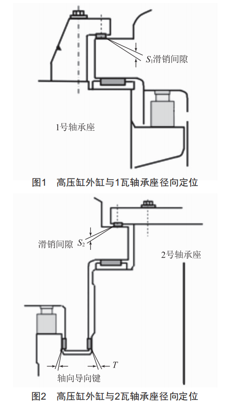(2)高壓缸缸體與軸承座的徑向定位:高壓缸缸體與軸承座的徑向定位,可通過高壓缸各滑銷間隙來確認(rèn),如圖1、圖2中s1(標(biāo)準(zhǔn):0.10~0.15mm)、s2(標(biāo)準(zhǔn):0.35~0.405mm)及T(標(biāo)準(zhǔn):0.15~0.20mm)所示。