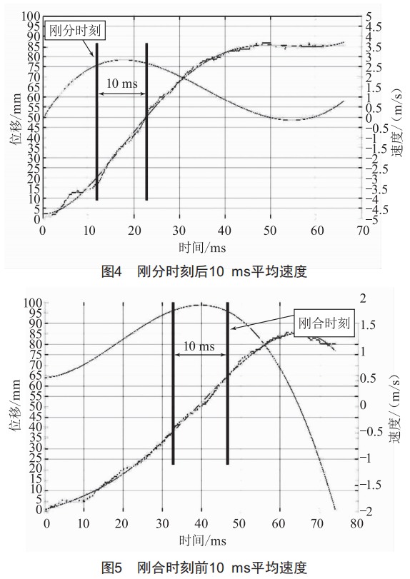 (10)計(jì)算剛分后/剛合前10ms平均速度:通過速度曲線和剛分時(shí)刻進(jìn)行積分后除以10ms獲得分合閘速度,或通過位移曲線計(jì)算位移總和后除以10ms獲得分合閘速度,如圖4、圖5所示。