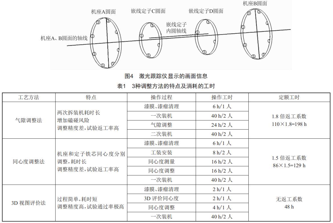 從表1可以看出,利用激光跟蹤儀,使用3D視圖評價法調整定子同心度具有極高的效率和精度,能大量節(jié)約成本和人工。
