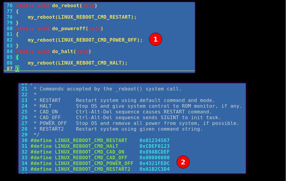 首先在busybox上查詢(xún)poweroff是哪個(gè)系統(tǒng)調(diào)用,它向內(nèi)核傳遞一個(gè)宏。LINUX_REBOOT_CMD_POWER_OFF=0x4321FEDC