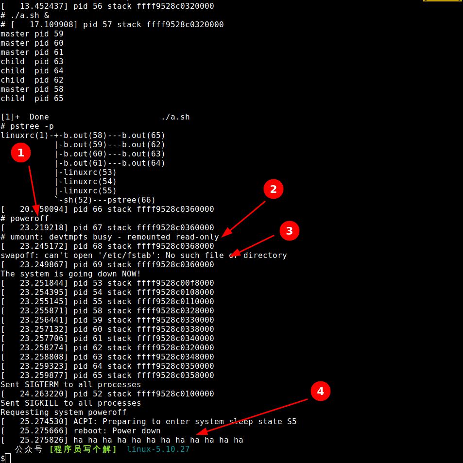 結(jié)束3個(gè)init進(jìn)程和4個(gè)b.out進(jìn)程;