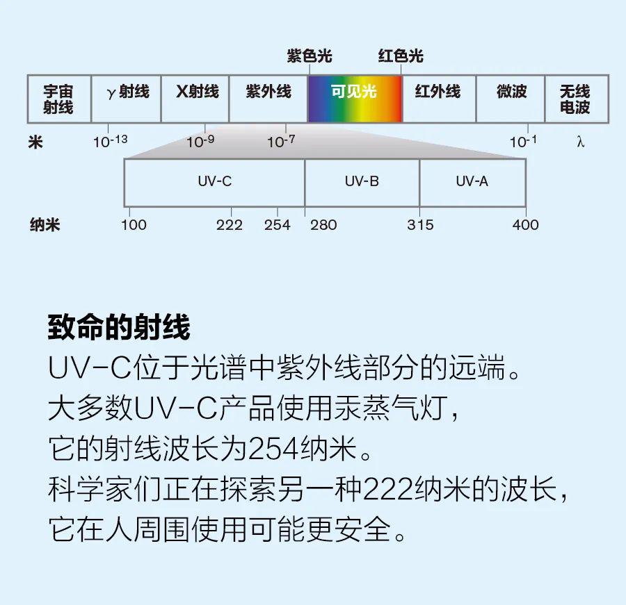 首先,專家指出,并不是所有的紫外線都是一樣的。紫外線位于電磁光譜中靛藍和紫羅蘭之外的區(qū)域??催^防曬霜標簽的人都知道,讓你曬黑或曬傷的紫外線被稱為UV-A(波長介于400到315納米)和UV-B(波長315到280納米)。紫外線殺菌技術則主要使用波長更短、能量更強的紫外線,即UV-C,波長介于280到100納米之間。地球的臭氧層幾乎阻止了所有UV-C光射到我們身上。因此,進化了數(shù)百萬年甚至數(shù)十億年的微生物和病毒(乃至世間萬物)從未暴露在這些波長的紫外線下。