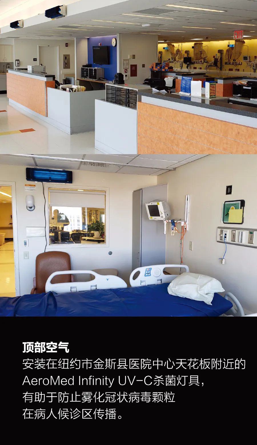 UV Resources公司的薩普塔說,在這種劑量下,頂部燈具可在“幾秒鐘內”摧毀照射范圍內的細菌。為了保證人的安全,這些每件價格幾千美元的燈具安裝在2米以上的地方,并使用非反射擋板引導紫外線能量向上和向外傳遞。(UV-C在大多數(shù)表面上反射效果很差,因此從天花板和其他裝置上反射過來的光線幾乎沒有暴露危險;盡管如此,安裝人員必須使用UV-C計量表驗證。)還可安裝用于各種環(huán)境,如病房、候診室、大堂、樓梯間、急診室入口和走廊等。