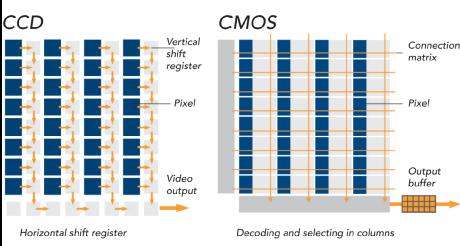 CEO冀運(yùn)景告訴我,最近幾年,采用CMOS傳感技術(shù)的高性能工業(yè)相機(jī)已經(jīng)是絕對(duì)主流了,處理速度非??欤上褓|(zhì)量也令人滿意。速度是關(guān)鍵:With CCD sensors (left) the charge is shifted pixel by pixel, in the CMOS sensor the charge of each pixel is directly converted to a voltage and read – making it noticeably faster.