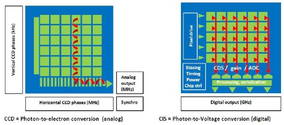 CEO冀運(yùn)景告訴我,最近幾年,采用CMOS傳感技術(shù)的高性能工業(yè)相機(jī)已經(jīng)是絕對主流了,處理速度非???,成像質(zhì)量也令人滿意。速度是關(guān)鍵:With CCD sensors (left) the charge is shifted pixel by pixel, in the CMOS sensor the charge of each pixel is directly converted to a voltage and read – making it noticeably faster.