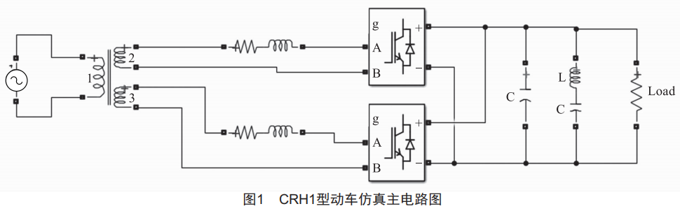 以CRH1型動(dòng)車為例,確定其超高次諧波源發(fā)生裝置拓?fù)鋱D后,建立仿真電路主電路,如圖1所示。