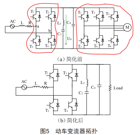 時(shí)域仿真時(shí),隨著網(wǎng)絡(luò)的增大,程序運(yùn)行時(shí)間將大量增加,因此建模時(shí)應(yīng)合理簡(jiǎn)化裝置拓?fù)?。超高次諧波源建模采用簡(jiǎn)化分析法,將超高次諧波源裝置內(nèi)與諧波特性無(wú)關(guān)的元件作等效處理。例如,CRH1型動(dòng)車逆變電路與整流電路間有直流穩(wěn)壓電路,所以逆變電路不影響網(wǎng)側(cè)諧波含量,將其等效為一個(gè)電阻性負(fù)載。簡(jiǎn)化前后的動(dòng)車變流器如圖5所示。