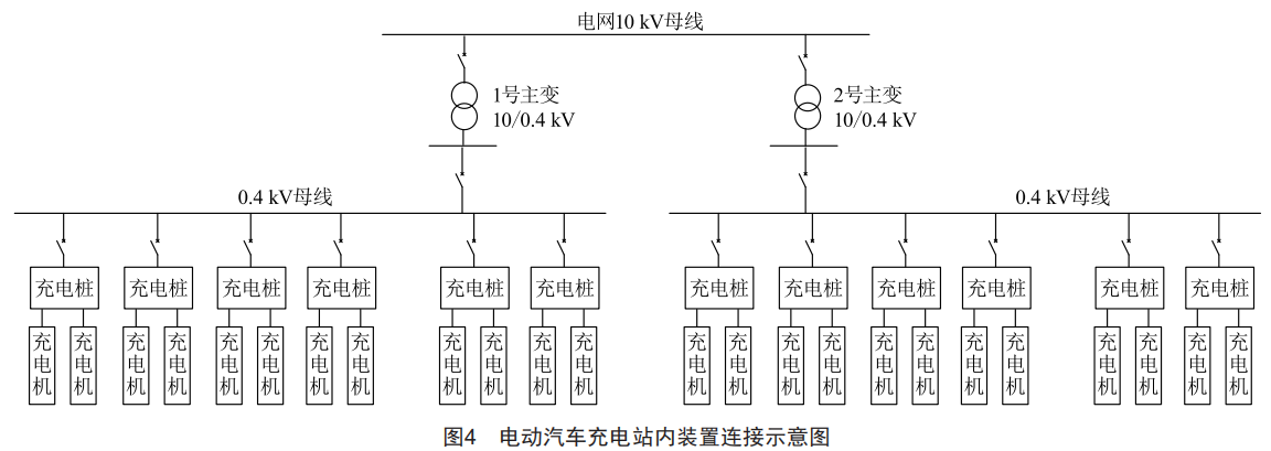 而對(duì)于電動(dòng)汽車來(lái)說(shuō),單個(gè)的電動(dòng)汽車充電機(jī)組不會(huì)直接接入電網(wǎng),需要按照常規(guī)電動(dòng)汽車充電站的充電機(jī)配置臺(tái)數(shù)以及連接方式建立電動(dòng)汽車充電站時(shí)域仿真模型,不同區(qū)域的電動(dòng)汽車充電站能提供的最大功率不同,站內(nèi)裝置的連接方式也有區(qū)別,但工作原理都較為一致,一般可選用功率適中且實(shí)際較為常用的電動(dòng)汽車充電站來(lái)進(jìn)行建模研究。電動(dòng)汽車充電站內(nèi)裝置連接示意圖如圖4所示。圖4中每個(gè)充電樁包含兩臺(tái)充電機(jī),單臺(tái)變壓器容量為0.5MVA。