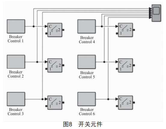 對(duì)于電動(dòng)汽車充電站來(lái)說(shuō),其內(nèi)部的電動(dòng)汽車充電樁工作狀態(tài)不確定,受多種因素影響。為了更準(zhǔn)確地對(duì)電動(dòng)汽車充電站的諧波發(fā)射特性進(jìn)行研究,需模擬站內(nèi)電動(dòng)汽車充電樁的啟停狀態(tài)。通過(guò)對(duì)電動(dòng)汽車充電站各時(shí)段內(nèi)充電樁工作狀態(tài)的統(tǒng)計(jì),可以得到各時(shí)段內(nèi)電動(dòng)汽車充電樁工作臺(tái)數(shù)的概率密度函數(shù),因此可以利用蒙特卡洛法仿真模擬各電動(dòng)汽車充電樁的開關(guān)狀態(tài)。例如,將Mat1ab中生成蒙特卡洛信號(hào)的m文件作為仿真模型準(zhǔn)備程序,生成的開關(guān)信號(hào)將直接作用在開關(guān)控制器上,控制開關(guān)狀態(tài)。圖8是開關(guān)元件,圖9為利用蒙特卡洛法生成的開關(guān)信號(hào)。