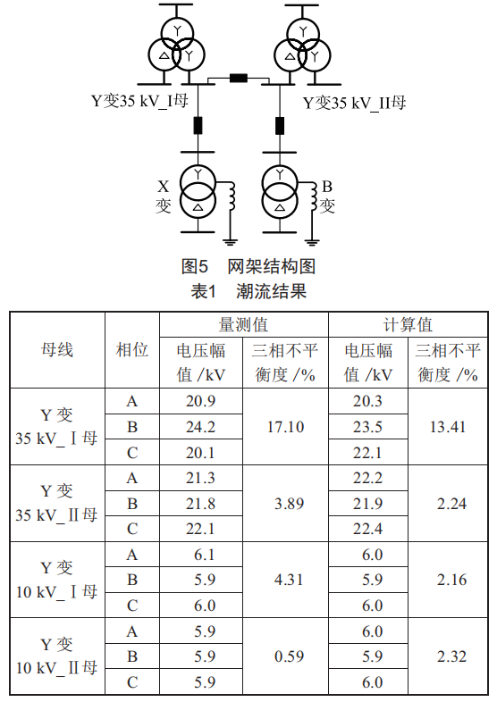 首先,根據(jù)提供的信息,得到計(jì)算潮流結(jié)果與實(shí)際量測(cè)值對(duì)比如表1所示。然后,根據(jù)本文提出的成因分析流程對(duì)設(shè)備參數(shù)、負(fù)荷參數(shù)進(jìn)行攝動(dòng),對(duì)比發(fā)現(xiàn),調(diào)整接地阻抗的參數(shù)對(duì)電壓不平衡度的影響最大。最終,判定接地阻抗為三相電壓不平衡的主要成因。
