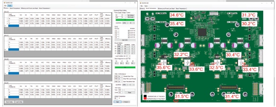 除了演示板本身之外,測試設(shè)置和測試方法對于數(shù)據(jù)和結(jié)果的公正同樣很重要。為此,團隊還創(chuàng)建了一個具有圖形用戶界面(GUI)的配套評估軟件,如圖4所示,以支持用戶更加輕松地開展測試和收集數(shù)據(jù)。用戶只需要指定輸入和輸出參數(shù),軟件將負責(zé)自動化測試。軟件自動控制相應(yīng)的測試和測量設(shè)備,例如直流電源、電子負載和多路復(fù)用數(shù)據(jù)采集器件(DAQ),以直接從演示板測量溫度、電流和電壓數(shù)據(jù),然后在GUI上呈現(xiàn)測量結(jié)果曲線。軟件還通過PMBus/I2C協(xié)議收集來自板載器件的重要遙測數(shù)據(jù)。所有這些信息對于比較系統(tǒng)效率和功率損耗都很重要。