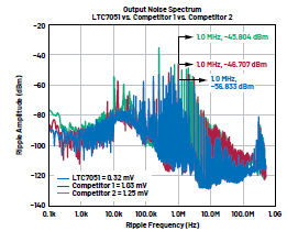 同樣,LTC7051和競爭器件也進行了輸出噪聲擴頻測量,如圖9所示。LTC7051優(yōu)于其他DrMOS器件,并顯示出在開關(guān)頻率下產(chǎn)生的噪聲低于競爭器件的噪聲。噪聲差約為1 mV rms。