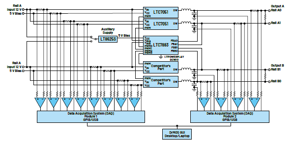 為了演示LTC7051的主要特性,ADI公司創(chuàng)建了一個評估板,用以展示LTC7051與競爭產(chǎn)品的性能對比。這種演示平臺有助于以一種公正、準確的方式比較LTC7051 DrMOS與競爭產(chǎn)品的基本參數(shù),例如效率、功率損耗、遙測精度、熱和電氣性能。比較的目的是消除對結(jié)果有效性的任何懷疑。該演示平臺用于突出一流的DrMOS性能指標,而與制造商無關(guān)。