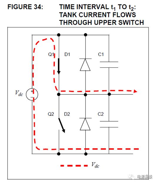 t1-t2之間的工作狀態(tài)比較簡單,Q1的開關(guān)是導(dǎo)通的,因此諧振腔電壓為正,諧振腔電流也為正,輸入源Vdc向輸出傳遞能量。