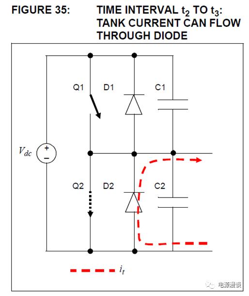 在t2時刻時,Q1是關(guān)閉的,而諧振電流為正,因此只能流過Q2的體二極管D2,Q2兩端的電壓就非常小,在t2和t3之間的時刻開通Q2,這個開關(guān)就會得到ZVS開通的特性,開通損耗非常小。