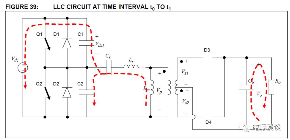 在t0時刻,電路中的開關(guān)均處于turn off狀態(tài),諧振腔電流中只有磁化電流且為負電流,這個電流流入電容中點進入Q1的體二極管,此時若turn on Q1開關(guān),則由于Q1兩端的電壓非常小,則開通損耗就非常小。所以,一般認為只要在t0-t1之間的時刻開通Q1,則Q1的開通損耗非常小,此時電路處于感性工作區(qū)域,且得到ZVS開通特性。