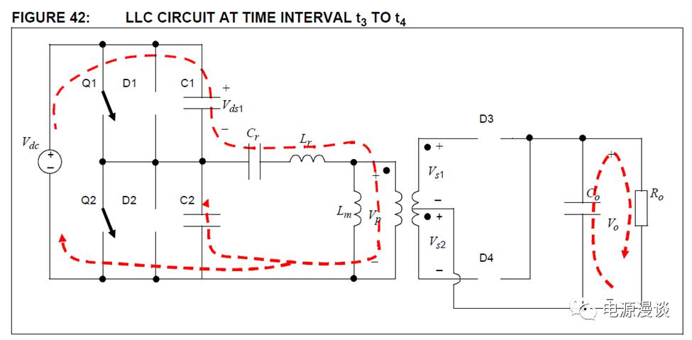 t3-t4之間段,半橋開關(guān)的下管Q2導(dǎo)通,諧振電流流入電容中點,因此這個階段輸入源通過Q2開關(guān)向輸出傳遞能量,此時電壓和電流的方向都是負的。