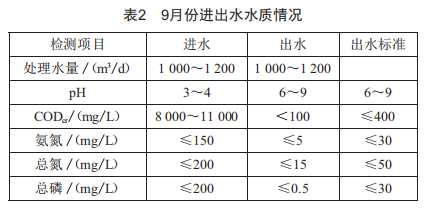 AAO池于7月份完成土建施工,之后利用新建事故池區(qū)域存儲(chǔ)大量未處理的生產(chǎn)污水,以此作為好氧池污泥培養(yǎng)的碳源,從原CASS池中引入污泥作為接種源,采用間歇性進(jìn)水和悶曝方式培養(yǎng)污泥。待8月份污泥濃度達(dá)到3000mg/L(此時(shí)SV30達(dá)到30%左右)時(shí),開啟內(nèi)回流模式,逐漸提高厭氧區(qū)和缺氧區(qū)的污泥濃度。AAO池調(diào)試初期由于反硝化細(xì)菌生長(zhǎng)緩慢,出水總氮經(jīng)兩周左右才逐漸達(dá)標(biāo),經(jīng)過一個(gè)月的水質(zhì)調(diào)試,最終實(shí)現(xiàn)達(dá)標(biāo)穩(wěn)定排放,進(jìn)出水參數(shù)如表2所示。