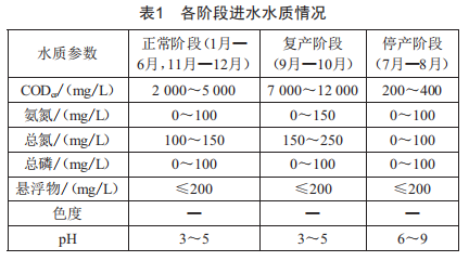 根據(jù)污水處理站提供的2018-01-01至2019-10-23的運(yùn)行數(shù)據(jù),同時(shí)對(duì)主要構(gòu)筑物的進(jìn)出水?dāng)?shù)據(jù)進(jìn)行分析,主要包括CoDcr、氨氮、總氮、總磷、pH等,分別得出正常階段、復(fù)產(chǎn)階段、停產(chǎn)階段污水處理站的進(jìn)水水質(zhì)參數(shù),如表1所示。