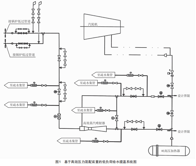 方案六(采用方案):通過對(duì)現(xiàn)有方案的分析比較,結(jié)合現(xiàn)場實(shí)際情況,公司從對(duì)機(jī)組整體效率影響最小的角度出發(fā),提出一種基于高效壓力混配裝置的低負(fù)荷給水提溫技術(shù)。通過增設(shè)高效蒸汽噴射器,利用低過高品質(zhì)蒸汽引射一抽蒸汽,混合后進(jìn)入#1高加,提高進(jìn)汽參數(shù)及#1高加進(jìn)汽量,從而提升給水溫度,達(dá)到減少省煤器區(qū)域吸熱量,提高省煤器出口煙氣溫度的目的:同時(shí)增設(shè)高效蒸汽噴射器旁路系統(tǒng),以保證高效蒸汽噴射器可隨時(shí)退出運(yùn)行?;诟咝毫炫溲b置的低負(fù)荷給水提溫技術(shù)系統(tǒng)如圖1所示。