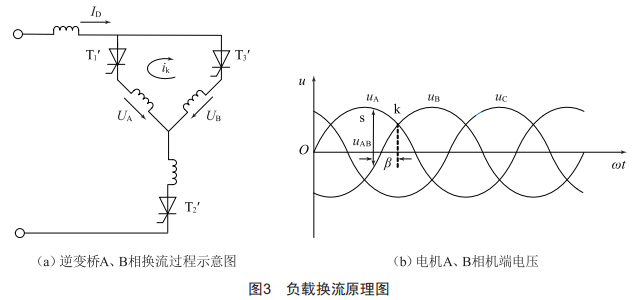 在晶閘管需要換相時(shí),使流過晶閘管電流過零后再施加一定時(shí)間的反向電壓,原來導(dǎo)通的晶閘管才能可靠關(guān)斷,在此期間觸發(fā)另一支路的晶閘管,該晶閘管因承受正向電壓而被導(dǎo)通,從而實(shí)現(xiàn)逆變電路的可靠換流。負(fù)載換流原理圖如圖3所示,其中圖3(a)為逆變橋A、B相換流過程示意圖。在換流之前,晶閘管T1'、T2'導(dǎo)通,直流電流ID以A、C相繞組為回路,現(xiàn)在要使電流從AC相換流到BC相,要使待關(guān)斷的晶閘管T1'承受反向電壓,應(yīng)在自然換相點(diǎn)k之前導(dǎo)通晶閘管T3',T1'電流減小為零并承受一段時(shí)間反壓后關(guān)斷。觀察圖3(b)電機(jī)A、B相機(jī)端電壓,如果在k點(diǎn)觸發(fā)晶閘管T3',此后電壓uAkuB,晶閘管T1'承受正向電壓將繼續(xù)導(dǎo)通,而T3'經(jīng)過觸發(fā)后承受反向電壓無法導(dǎo)通,將導(dǎo)致?lián)Q流失敗。