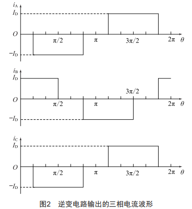 由于直流回路平波電抗器Ls的存在,直流電流ID的幅值在一個(gè)周期內(nèi)近似恒定不變,逆變電路按照1204的導(dǎo)電工作方式,在觸發(fā)上橋臂晶閘管導(dǎo)通時(shí),下橋臂處于關(guān)斷狀態(tài),三相橋臂觸發(fā)信號(hào)相位差1204。忽略逆變電路的換相過程,則逆變電路輸出的三相電流波形如圖2所示。
