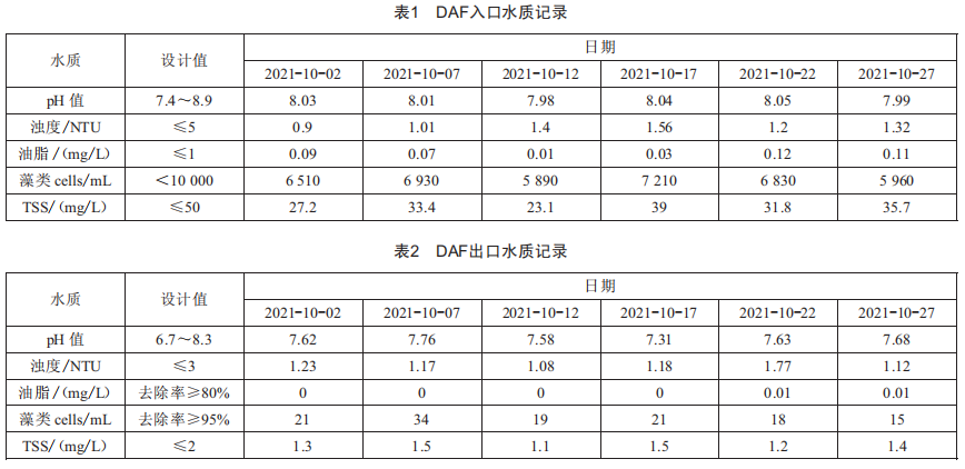 從DAF系統(tǒng)入口和出口的水質(zhì)檢測記錄可以得出,該氣浮(DAF)系統(tǒng)對海水濁度、油脂、藻類、總懸浮固體(TSS)的處理效果能夠達(dá)到設(shè)計要求。