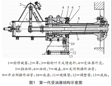 為有效提高龍王臺(tái)水電站3×7MW燈泡貫流式機(jī)組的自動(dòng)化程度,實(shí)現(xiàn)設(shè)備的無(wú)人值守,降低設(shè)備的巡檢要求,對(duì)于3×7MW燈泡貫流式機(jī)組易發(fā)故障節(jié)點(diǎn)進(jìn)行了技術(shù)升級(jí)改造,從源頭上減少故障隱患,進(jìn)而提高該3×7MW燈泡貫流式機(jī)組運(yùn)行的安全性和可靠性。受油器是龍王臺(tái)水電站3×7MW燈泡貫流式機(jī)組的關(guān)鍵設(shè)備,由于其采用的是第一代受油器,工作性能不佳,易發(fā)生漏油、軸承斷裂等安全故障,在燈泡貫流式機(jī)組自動(dòng)化升級(jí)改造的大背景下,必須對(duì)第一代受油器進(jìn)行升級(jí)改造。