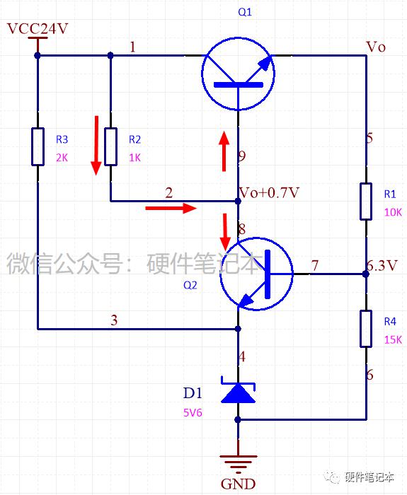 由于Q1的基極電壓被三極管鉗位,所以其基極電壓為Vo+0.7V,