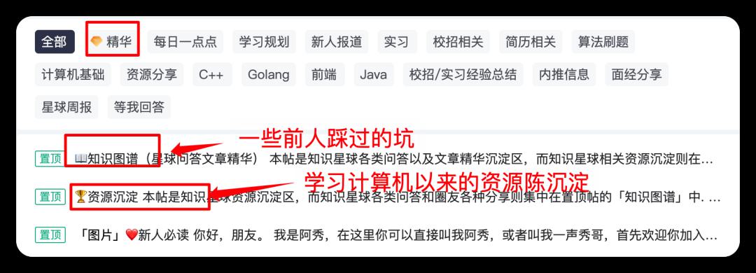 以上就是這位學(xué)弟的分享了,學(xué)計算機都知道有個局部性原理其實很多時候你現(xiàn)在所困惑和不解的問題,你的學(xué)長學(xué)姐們已經(jīng)遇到過了,如果可以的話建議你多看看他們踩過的坑,阿秀自己組建的學(xué)習(xí)圈置頂帖中有個「知識圖譜」和「精華區(qū)」(如下圖),其中有很多計算機大學(xué)四年學(xué)習(xí)以及校招的內(nèi)容和問題,多看看這些能夠幫你走的更穩(wěn)、更順,此外也陸陸續(xù)續(xù)沉淀了不少自己這么些年收集和整理到的學(xué)習(xí)編程的資料。