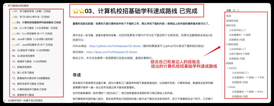 此外還有一些過來人的學(xué)習(xí)路線和項目推薦,這就更不用說了,比如為一些計算機基礎(chǔ)薄弱的小伙伴專門寫了一個計算機校招基礎(chǔ)學(xué)科速成路線。