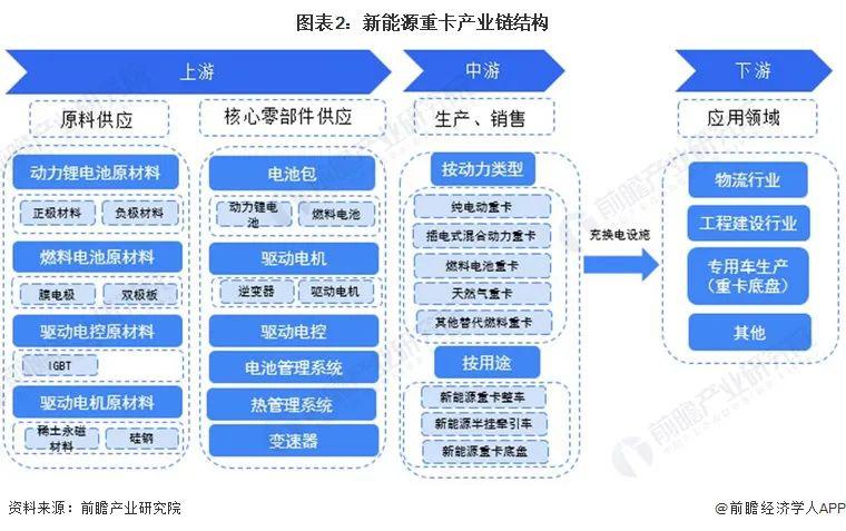 2、產(chǎn)業(yè)鏈剖析新能源重卡行業(yè)產(chǎn)業(yè)鏈上游包括原材料和零部件,其中,新能源重卡原材料包括動(dòng)力電池原材料(正、負(fù)極材料)、燃料電池原材料(膜電極、雙極板)、驅(qū)動(dòng)電控原材料(IGBT)、驅(qū)動(dòng)電機(jī)原材料(稀土永磁材料、硅鋼)等;零部件包括電池包、驅(qū)動(dòng)電機(jī)、驅(qū)動(dòng)電控、電池管理系統(tǒng)、熱管理系統(tǒng)、變速箱等。通過(guò)充換電設(shè)施等配套,新能源重卡應(yīng)用于物流運(yùn)輸行業(yè)(如快遞、物資運(yùn)輸)、工程運(yùn)輸(如建筑業(yè)、公路鐵路建設(shè)、市政工程建設(shè))、專用車生產(chǎn)(主要是重卡底盤)等。