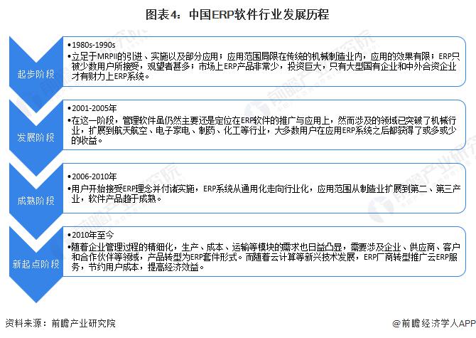 中國(guó)ERP軟件行業(yè)發(fā)展較早,目前行業(yè)已經(jīng)較為成熟。行業(yè)經(jīng)歷過(guò)起步階段、發(fā)展階段、成熟階段,目前處于轉(zhuǎn)折新起點(diǎn)階段。從一開(kāi)始ERP僅僅被少部分用戶接受,到后來(lái)企業(yè)主動(dòng)接納ERP軟件,再到ERP軟件行業(yè)化趨勢(shì)走強(qiáng),現(xiàn)如今ERP軟件已經(jīng)不僅僅局限于企業(yè)內(nèi)部,主流廠商開(kāi)始提供以ERP為核心的套裝軟件,完整的ERP套件已超出了企業(yè)范疇,涉及企業(yè)、供應(yīng)商、客戶和合作伙伴等領(lǐng)域;而如今的服務(wù)方式,不再是以往的購(gòu)買軟件、安裝硬件才能使用,云計(jì)算讓付費(fèi)更加靈活,服務(wù)更加便捷,節(jié)約了用戶成本,使得行業(yè)整體經(jīng)濟(jì)效益有所提高。