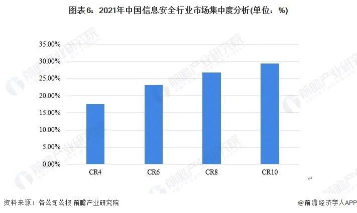 2021年,我國信息安全行業(yè)市場集中度處于一般水平。具體來看,CR4為17%左右,CR6-CR10均在20%-30%之間。表明信息安全行業(yè)的市場競爭較為激烈。