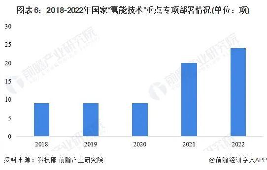 為推進氫能技術(shù)發(fā)展及產(chǎn)業(yè)化,國家重點研發(fā)計劃啟動實施“氫能技術(shù)”重點專項。2018-2022年,“氫能技術(shù)”重點專項數(shù)量逐年增加。2018年僅9項技術(shù)專項,到2022年,“氫能技術(shù)”重點專項圍繞氫能綠色制取與規(guī)模轉(zhuǎn)存體系、氫能安全存儲與快速輸配體系、氫能便捷改質(zhì)與高效動力系統(tǒng)及“氫能萬家”綜合示范4個技術(shù)方向,擬啟動24項重點專項。