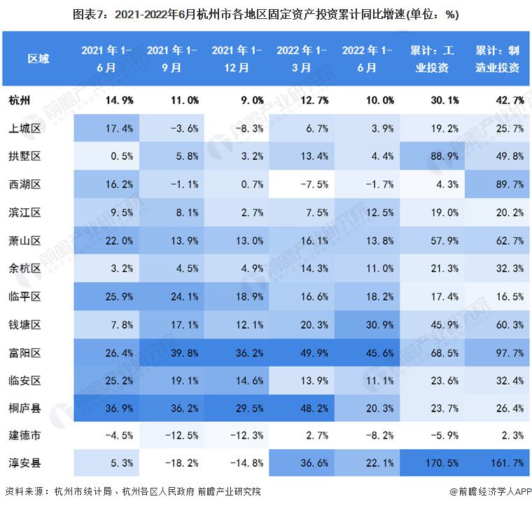 注:橫軸代表“人均工業(yè)產(chǎn)值”;縱軸代表“工業(yè)產(chǎn)值地均集約度”;氣泡大小代表“規(guī)上工業(yè)產(chǎn)值”;虛線代表“杭州市水平”。3、2022年1-6月杭州市投資走勢對比