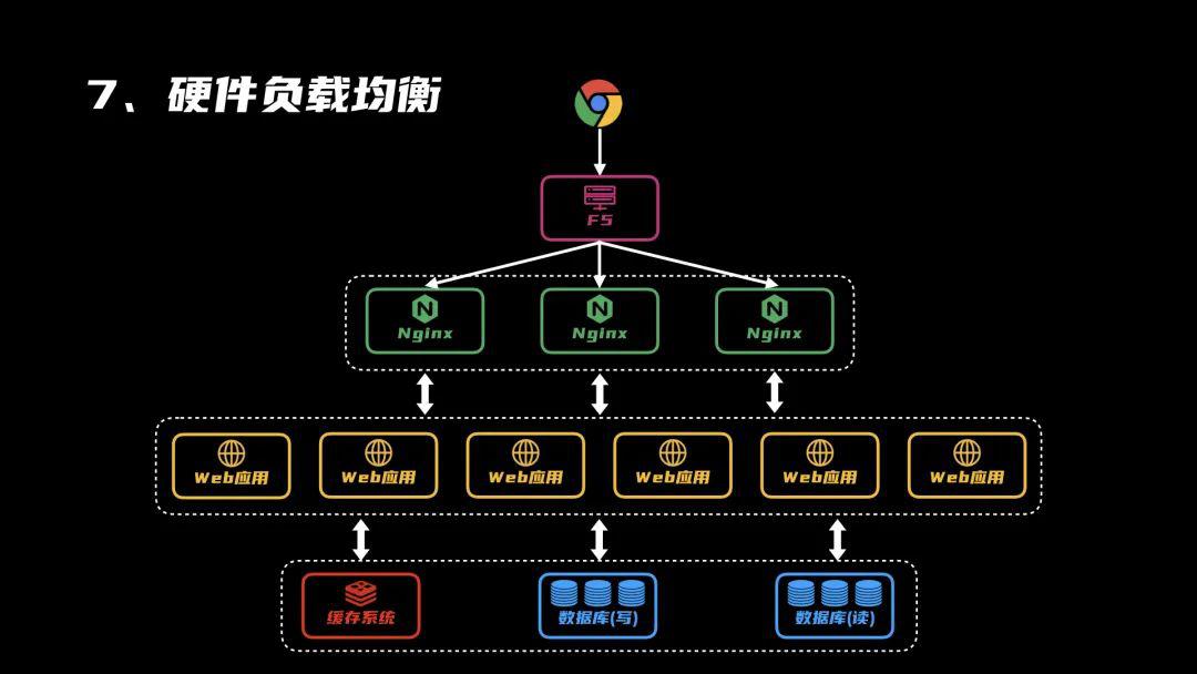 一臺不夠,那就多整幾臺,再引入一個硬件負(fù)載均衡的服務(wù)器,比如F5,將網(wǎng)絡(luò)流量分發(fā)到不同的Nginx服務(wù)器上,再一次提高性能。