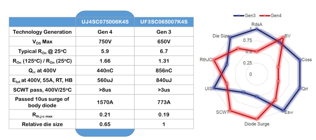 與第3代器件相比,第4代SiC FET有若干方面的改進(jìn),從“雷達(dá)”圖中能清楚看到。