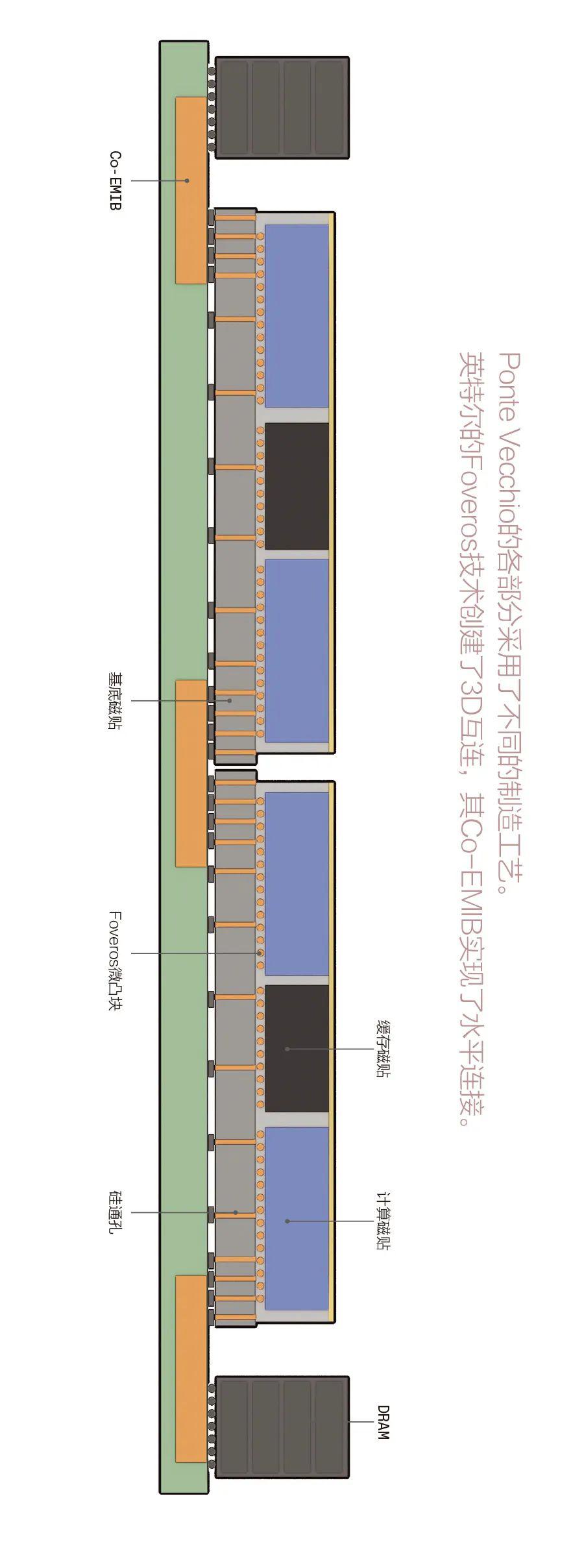 英特爾院士威爾弗雷德?戈麥斯(Wilfred Gomes)在ISSCC上對各位工程師說,這款處理器將英特爾的2D和3D集成技術(shù)推向了極限。每個Ponte Vecchio實際上是兩組使用英特爾2.5D集成技術(shù)Co-EMIB連接在一起的鏡像芯粒。Co-EMIB是“共嵌式多裸片互連橋接”的縮寫,它在兩個3D芯粒堆棧之間形成了高密度互連硅橋。Co-EMIB裸片還將高帶寬內(nèi)存和一個I/O芯粒連接到了其余芯粒堆疊的“基底磁貼”上。基底磁貼采用了英特爾的3D集成技術(shù)Foveros,將計算和緩存芯粒堆疊其上。Foveros使用微凸塊(每根頂部有一個微米寬焊球的短銅柱)使垂直連接相隔幾十微米。信號和電源通過硅通孔進入該堆棧。8個計算磁貼、4個緩存磁貼和8個給處理器散熱的空白“熱”磁貼都連接到了基底磁貼上?;状刨N本身具備高速緩存和允許任何計算磁貼訪問任何存儲元件的網(wǎng)絡(luò)。