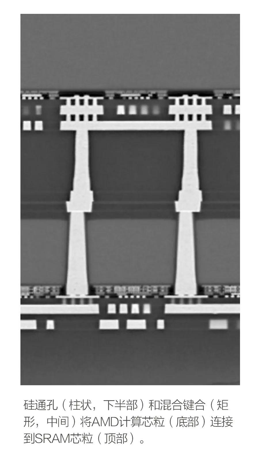 新款Zen 3計算芯粒及其前代版本均采用了相同的臺積電(TSMC)制造工藝,因此其晶體管大小、互連和其他屬性均相同。但是AMD對Zen 3做了很多架構(gòu)修改,因此即使沒有額外的高速緩存,其時鐘運行速度也提高了6%,平均性能也提高了19%。在這些架構(gòu)瑰寶之上,還有一組硅通孔(TSV),即直接穿透大部分硅的垂直互連。硅通孔構(gòu)建在Zen 3的最后一級緩存中,也就是名為L3的靜態(tài)隨機存取存儲器(SRAM)塊中。緩存位于計算芯粒的中間,并由其全部8個內(nèi)核共享。在處理大量數(shù)據(jù)工作負(fù)載的處理器中,Zen 3晶圓的背面被減薄,使得硅通孔暴露出來。然后,使用混合鍵合(參見補充介紹“3D技術(shù)”)將64MB的SRAM芯粒連接到這些暴露出來的硅通孔上。后一種技術(shù)可以每隔9微米在CPU內(nèi)核和高速緩存之間形成連接。最后,為了結(jié)構(gòu)穩(wěn)定性和便于熱傳導(dǎo),附加上空白硅芯粒以覆蓋Zen 3 CPU裸片的其余部分。以2.5D排列形式在CPU 裸片旁額外添加緩存并不可取,因為數(shù)據(jù)要花很長時間才能到達處理器內(nèi)核。AMD高級研究員、設(shè)計工程師約翰?吳(John Wuu)在今年2月舉行的IEEE國際固態(tài)電路會議(ISSCC)上對虛擬參會者說:“雖然L3(緩存)的尺寸增加了兩倍,但3D V-cache只增加了4個(時鐘)周期的延遲,這只有通過3D堆疊才能實現(xiàn)?!?/span>