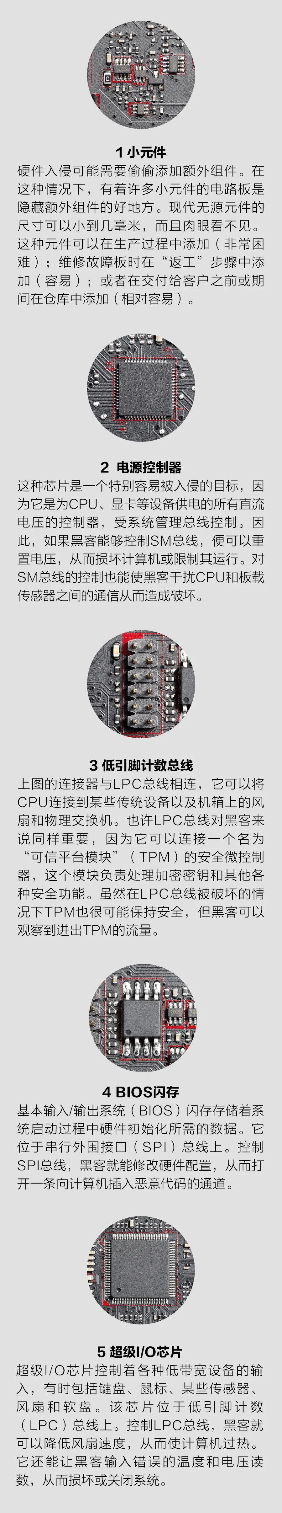 第三個目標(biāo)是LPC(Low Pin Count,低引腳計數(shù))總線,它特別容易受到攻擊,因為對其進行的攻擊可以破壞計算機的操作、遠程訪問電源和其他重要的控制功能,并危害開機過程的安全。這條總線包含7個必選信號和6個可選信號;用于將計算機的CPU連接到傳統(tǒng)設(shè)備(如串行和并行端口),或者連接到機箱上的物理交換機,在許多現(xiàn)代PC中,它的信號控制著風(fēng)扇。