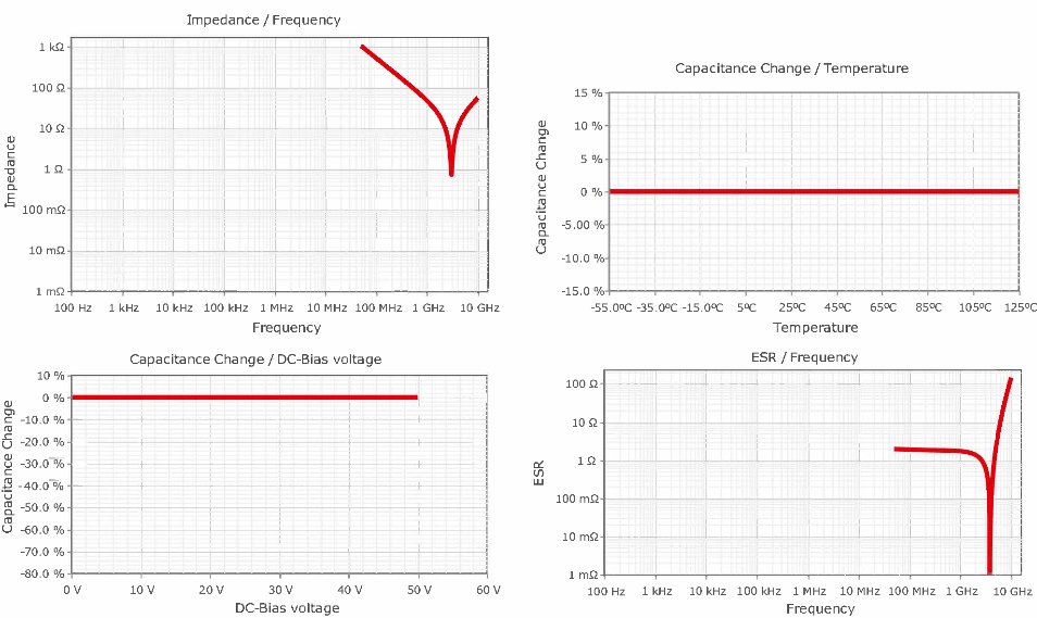 只有某些類型的電容適用于高頻應(yīng)用,例如 WCAP-CSRF 系列(料號(hào) 885392005010)。其規(guī)格書中的電氣參數(shù)在如圖 1 所示,包括諧振頻率、ESR、直流偏置漂移和溫度漂移。這些參數(shù)也可以在在線仿真平臺(tái)“REDEXPERT”(redexpert.we-online.com)上進(jìn)行仿真。