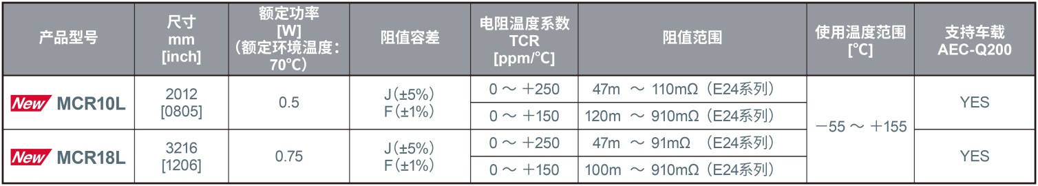 MCR10L(額定功率0.5W)和MCR18L(額定功率0.75W)是MCR系列通用型低阻值機(jī)型。以往產(chǎn)品MCR10和MCR18的額定功率都是0.25W,相比之下,額定功率均已顯著提升,TCR也得以改善。另外,此次產(chǎn)品更新旨在提高產(chǎn)品的性能,不僅改進(jìn)了器件結(jié)構(gòu),還對材料進(jìn)行了改良,未來可以穩(wěn)定供應(yīng)。