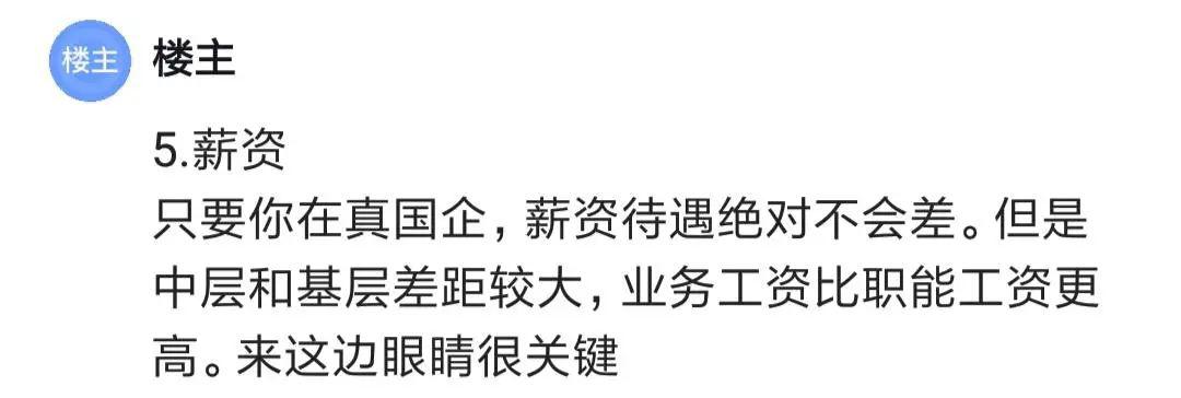 只要在真國企,薪資待遇不會差,但中層和基層差距較大,業(yè)務(wù)工資比職能工資更高。