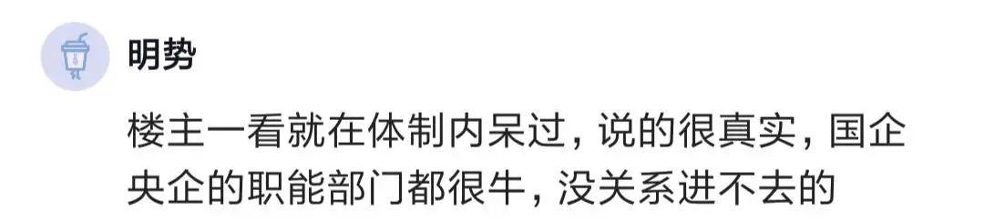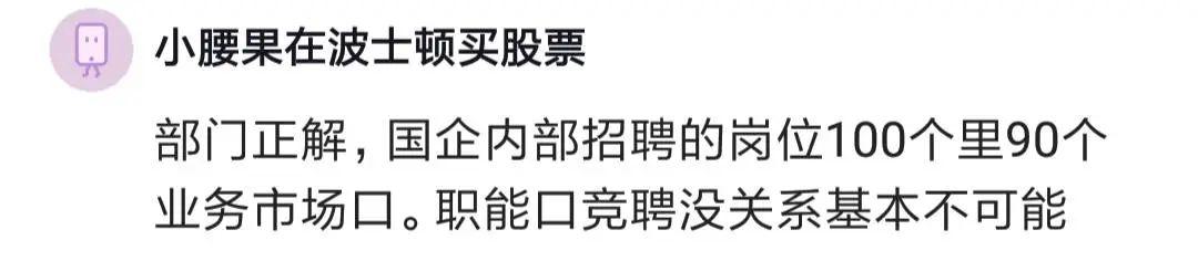 有人說,樓主一看就在體制內(nèi)待過,說的很真實,國企央企的職能部門很牛,沒關(guān)系進不去,招聘的大多是業(yè)務(wù)市場口。