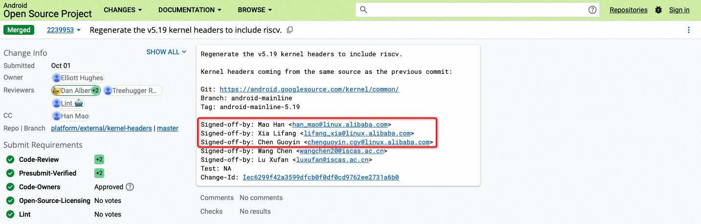 AOSP網(wǎng)站截圖顯示,安卓系統(tǒng)正式接收的首批RISC-V移植補(bǔ)丁,來自阿里平頭哥