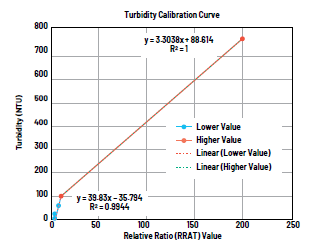 因?yàn)?0°散射測(cè)量對(duì)高渾濁度的響應(yīng)較差,所以響應(yīng)曲線(xiàn)分為兩個(gè)部分。一部分代表低濁度(0 NTU ~ 100NTU),另一部分代表高濁度(100NTU ~ 750NTU)。然后對(duì)每個(gè)部分進(jìn)行兩次線(xiàn)性擬合。即使現(xiàn)在有兩個(gè)方程值,仍然可以使用CN0503來(lái)快速顯示得出的NTU值。這是因?yàn)槊總€(gè)光路都可以在INS1和INS2中存儲(chǔ)自己的方程值。注意,INS1和INS2是相互依賴(lài)的。第一個(gè)方程INS1的結(jié)果是第二個(gè)方程INS2的輸入變量。存儲(chǔ)方程值之后,INS1可用于測(cè)量低濁度樣本,INS2可用于測(cè)量高濁度樣本。