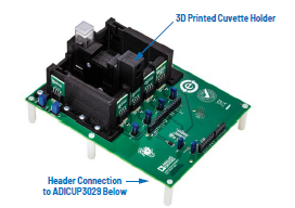 CN0503參考設(shè)計(jì)旨在使用ADPD4101快速制作液體分析測(cè)量原型。CN0503采用ADPD4101作為核心產(chǎn)品,但增加了四條模塊化光路,以及測(cè)量固件和應(yīng)用軟件,用于實(shí)施液體分析。CN0503直接連接至ADICUP3029板,用于管理測(cè)量例程和數(shù)據(jù)流。ADICUP3029板可以直接連接至筆記本電腦,以查看評(píng)估GUI中的結(jié)果。CN0503可以測(cè)量熒光、濁度、吸光度和色度。樣品在比色皿中制備,并放置在3D打印的比色皿支架中,支架中裝有光學(xué)元件,包括一個(gè)透鏡和分束器。將比色皿支架插入適當(dāng)?shù)墓饴?,以進(jìn)行即插即用測(cè)量。此外,LED和光電二極管卡可以切換,來(lái)實(shí)現(xiàn)更大程度的自定義。