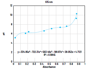 在每種情況下,繪出pH值與吸光度的關(guān)系圖,以創(chuàng)建校準(zhǔn)曲線(xiàn)。然后使用添加趨勢(shì)線(xiàn)選項(xiàng)來(lái)得到曲線(xiàn)的方程,通過(guò)這些方程來(lái)確定未知樣本的濃度。傳感器輸出是x變量,得到的y值是pH值。這項(xiàng)實(shí)驗(yàn)可以手動(dòng)完成,也可以使用CN0503來(lái)進(jìn)行這項(xiàng)實(shí)驗(yàn)。該固件采用兩個(gè)五階多項(xiàng)式INS1和INS2。將多項(xiàng)式保存之后,就可以選擇INS1或INS2模式,這樣會(huì)直接以所需的單位報(bào)告測(cè)量結(jié)果--在本例中是pH值。因此可以非常簡(jiǎn)單快速地獲取未知樣本的結(jié)果。